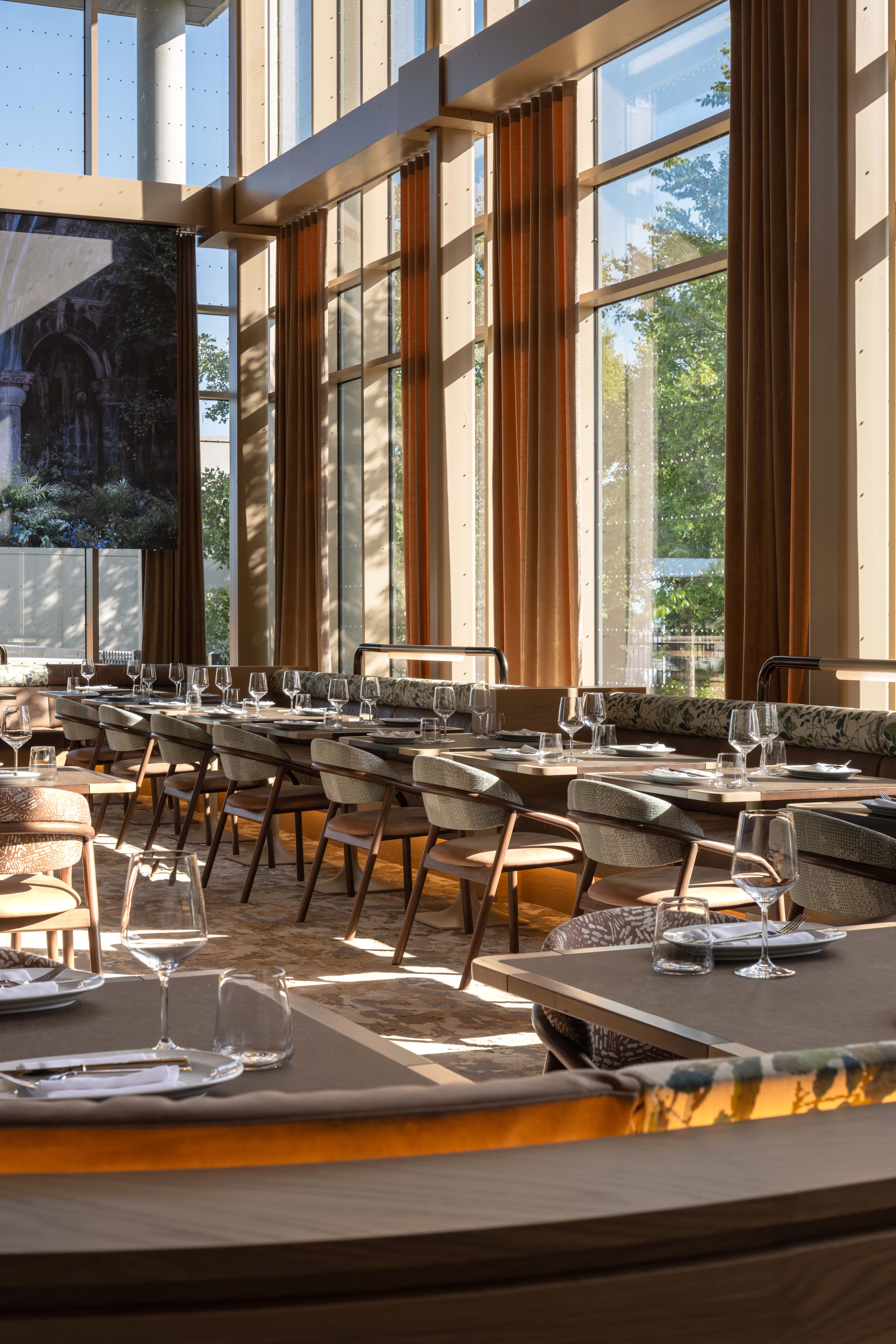 Circular banquettes, sculptural seating clusters, and stone-and-wood millwork form small zones that encourage conversation. Screens remain plentiful, but they are carefully integrated discreetly; hidden in millwork, built into windows, or deployed as drop-downs. This creates a subtle 360-degree field that makes the game feel ambient rather than dominant.